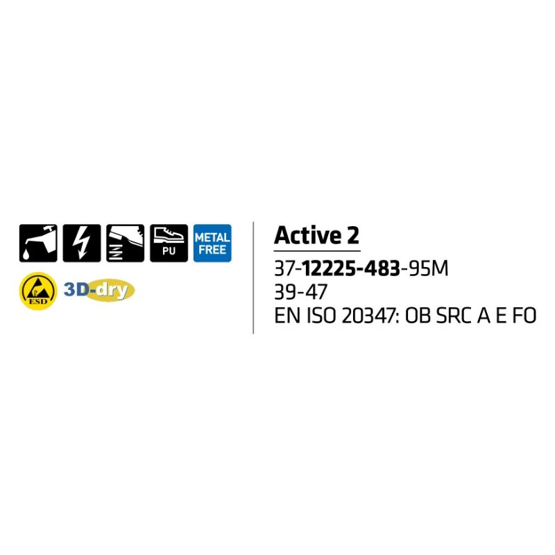 Sievi Active 1&2 pistokkaat täyttävät työjalkineilta vaadittavat perusominaisuudet. Kengät ovat myös ESD hyväksytyt ja metallittomat. Kengät voidaan helposti ja mukavasti kiristää tarrakiinnityksellä ja myös kantaremmillä. Jalat pysyvät kuivina hengittävän 3D-dry vuoren ansiosta. FlexStep®-kiilapohja on iskuja vaimentava, tukeva ja hyvin pitävä, se kestää myös öljyä ja useita kemikaaleja.