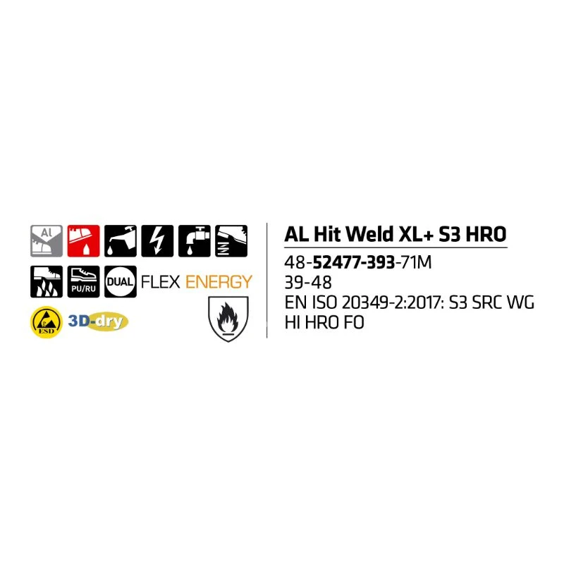 Sievi Al Hit Weld XL+ S3 HRO – hitsaustöihin soveltuvat hitsarin turvakengät. Sievi Al Hit Weld on hyvä valinta erityisesti hitsaustöihin: lämmönkestopohja kestää kuumuutta 300°C saakka ja ompeleet ovat kuumuutta kestävää Kevlaria. Turvakenkä on varustettu alumiinivarvassuojalla ja teräsnaulaanastumissuojalla. Al Hit Weld turvakengissä on FlexEnergy -joustoelementti, joka takaa äärimmäisen iskunvaimennuksen. Joustoelementti sitoo syntyvää liike-energiaa niin hyvin, että yli 55 % energiasta palautuu askellukseen. Tuote täyttää hitsausstandardin EN ISO 20349-2:2017 vaatimukset ja suojaavat hitsaustyössä esiintyviltä lämpöriskeiltä ja sulametalliroiskeilta.