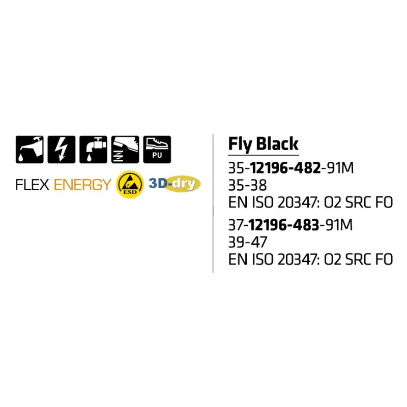 Sievi Fly on Sievi kenkien monipuolisuuden taidonnäyte, sillä nämä jalkineet soveltuvat moniin eri työtehtäviin, mutta myös vapaa-aikaan. Tämän tyylikkään, tennarityylisen kävely- ja työkengän päällinen on hengittävää tekstiiliä, joka tuntuu mukavalta jalkaa vasten. 3D-dry-vuoren sekä Sievi Comfort -pohjallisten ansiosta jalkasi pysyvät kuivina ja saavat hengittää tehokkaasti. Sievin kehittämä 3D-dry-vuori siirtää kosteutta tehokkaasti jalan pinnalta pois vuorimateriaalin ja päällisrakenteen kautta pois kengästä. Sievin kehittämä FlexStep®-pohjamateriaali takaa sekä pohjan pidon että kenkien mukavuuden – joustopohjan rakenne ehkäisee tehokkaasti jalkoihin ja selkärankaan kohdistuvaa rasitusta ja vaimentaa iskuja. Flexstep® kiilapohja kestää myös öljyä ja useita kemikaaleja, joten kengät soveltuvat monille aloille työkäyttöön. Tämän lisäksi Sievi Fly Black kengissä on käytetty Sievi Flexenergy®-kantavaimennusta, joka takaa kengän maksimaalisen iskunvaimennuksen ja näin ollen myös käyttömukavuuden! Flexenergy®- joustoelementti sitoo syntyvää liike-energiaa niin hyvin, että yli 55 % energiasta palautuu askellukseesi – siispä näillä kengillä askeleesi tuntuvat aina kevyiltä!