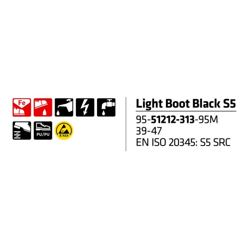 Sievi Light Boot Black S5 – Sievin musta kevytsaapas turvaominaisuuksilla. Märkiin olosuhteisiin tarkoitetut saappaat, joissa on varvas- ja naulaanastumissuojat terästä. Saapas on kestävää vettä pitävää materiaalia. ESD hyväksytty antistaattinen turvajalkine.
