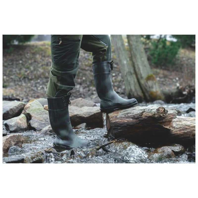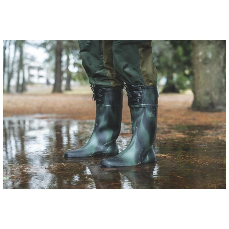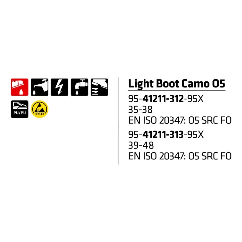Sievi Light Boot Camo 05 ovat nimensä mukaisesti kevyet kumisaappaat, jotka sopivat moneen. Nämä kevytsaappaat ovat jaloille mukava ja ennen kaikkea turvallinen valinta märkiin olosuhteisiin. Sievi Light Boot kevytsaappaissa käytetyn polyuretaani-mikrosolurakenteen ansiosta kengät ovat erittäin kevyet – paljon normaalia kumisaappaita kevyemmät – ja näin ollen myös miellyttävät käyttää silloinkin, kun on tarve liikkua paljon. Saappaiden materiaalina käytetyn polyuretaanin parhaita ominaisuuksia on keveyden lisäksi sen kulutuskestävyys. Polyuretaani on myös öljyn ja useiden kemikaalien kestävä, joka tekee siitä loistavan valinnan ammattijalkineeseen, jolloin kengältä vaaditaan paljon. Kengissä käytetty, Sievin kehittämä FlexStep®-pohjamateriaali ja joustopohjan rakenne ehkäisee tehokkaasti jalkoihin ja selkärankaan kohdistuvaa rasitusta ja vaimentaa iskuja. Light Boot Camo 05 kevytsaappaissa on teräksinen naulaanastumissuoja, joka antaa kenkiin ryhtiä ja kiertojäykkyyttä epätasaisessa maastossa. Lisäksi se ehkäisee terävien esineiden, kuten naulojen tai vaikkapa terävien kivien pääsyn pohjan läpi. Saappaissa on pitävä pohjakuviointi jonka ansiosta ne soveltuvat myös vaikeaan maastoon. Suomalaiseen jalkaan sopiva tilava lesti! Nämä ovat metsästäjien ja vaeltajien kestosuosikit!