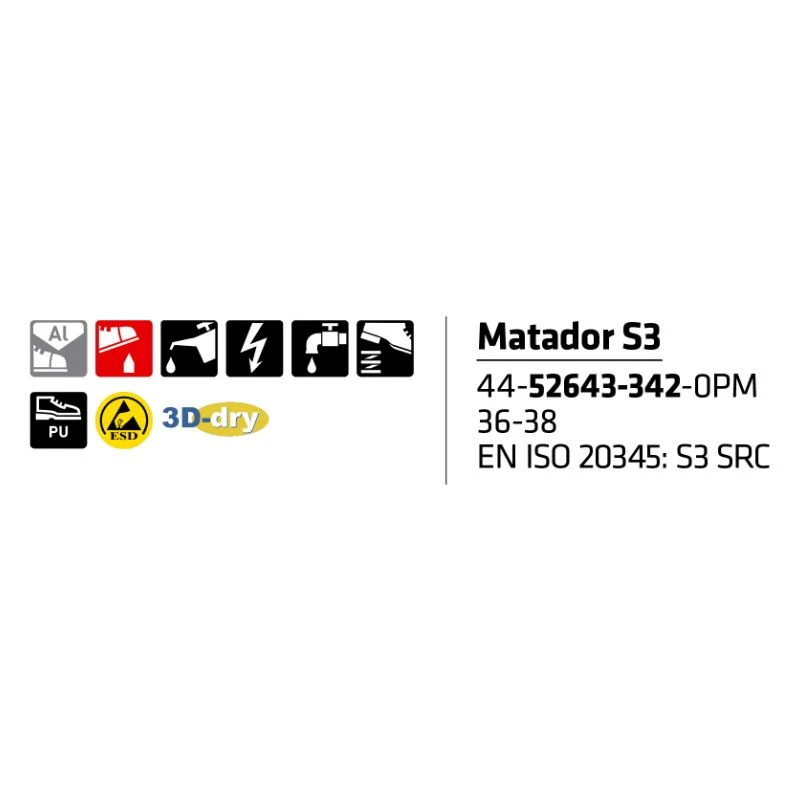 Sievi Matador S3 – matalavartinen turvajalkine. Turvakengät, joilla on mukava liikkua. Matador turvakengissä on varvassuoja alumiinia ja naulaanastumissuoja terästä. Kestää öljyä ja useita kemikaaleja. Antistaattinen, ESD hyväksytty jalkine.