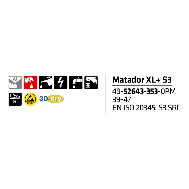 Sievi Matador XL+ S3 – matalavartinen turvajalkine. Näillä turvakengillä on mukava liikkua. Matador turvakengissä on varvassuoja komposiitti ja naulaanastumissuoja terästä. Kestää öljyä ja useita kemikaaleja. Antistaattinen ESD hyväksytty jalkine.