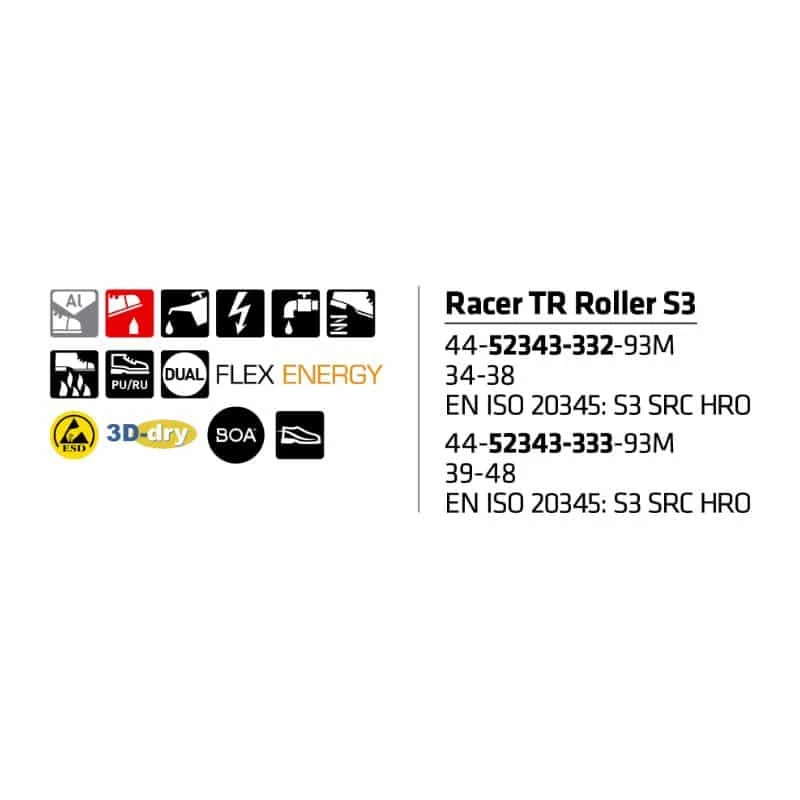 Sievi Racer Roller S3 turvakenkä BOA®-kiinnityksellä. Kevyt ja sporttinen malli. Kenkä tukee jalkaa anatomisesti ja on tehty hengittävästä PU-pinnoitetusta erikoisnahasta. Kengän TractionPro -kitkapohja on kestävä ja pitävä. Kengässä on FlexEnergy -joustoelementti joka antaa äärimmäisen iskunvaimennuksen. Tämä on ylivoimainen turvakenkä.
