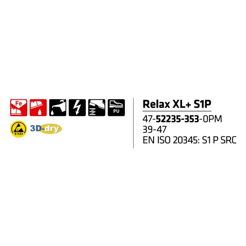 Sievi Relax XL S1P – kestävät turvajalkineet. Soveltuu erinomaisesti sisäkäyttöön, mutta sään suosiessa kestää myös ulkokäyttöäkin. Jalkine on varustettu teräskärjillä, kärkikupilla ja naulaanastumissuojalla. Kulutusta kestävä ESD hyväksytty turvaluokan S1 P SRC turvaluokan jalkine.