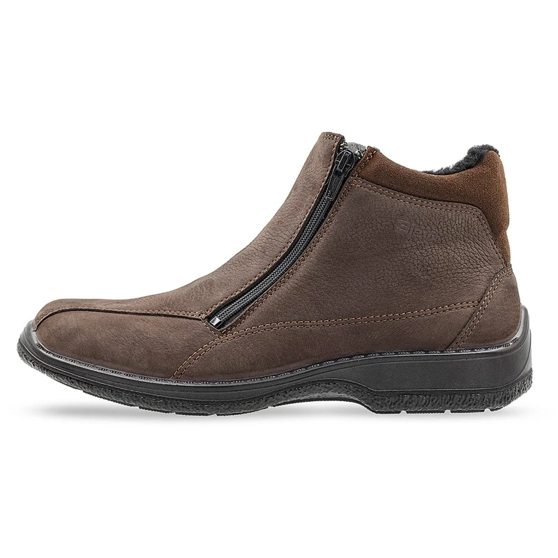 Miesten ruskeat talvinilkkurit tuplavetoketju kiinnityksellä. Päällinen on vesikestokäsiteltyä nupukkinahkaa. FlexStep®-kiilapohja on joustava, iskuja vaimentava, tukeva ja pitää hyvin pakkasessakin. Alumiinihuopapohja ja lämmin fleecevuori pitävät jalat lämpiminä.