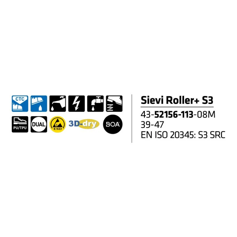 Sievi Roller S3 – turvakenkä BOA®-kiristysmekanismilla. Osta turvakengät, joilla jaksat kävellä koko päivän. Laadukas turvajalkine suojaa vaaroilta, mutta myös hengittää, istuu hyvin jalkaan ja hylkii vettä.
