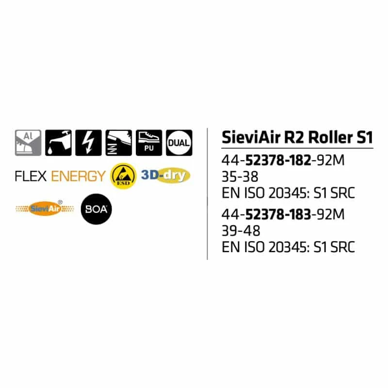 Sievi Air R2 Roller S1 turvakenkä BOA®-kiinnityksellä on kevyt ja hyvin hengittävä. Kenkä on valmistettu kestävästä ja hengittävästä mikrokuidusta. Turvakenkä on varustettu alumiinivarvassuojalla. Jalat pysyvät kuivina hengittävän 3D-dry vuoren ja SieviAir®-pohjaratkaisun ansiosta. Sievin patentoima SieviAir®-pohjaratkaisu toimii suodattimella, joka sijaitsee rei’itetyn sisäpohjan alla. Jokaisen askeleen yhteydessä suodatin painuu, ja lämmin kosteus, joka syntyy kengissä, virtaa ulos pohjan uloshengityskanavien kautta.