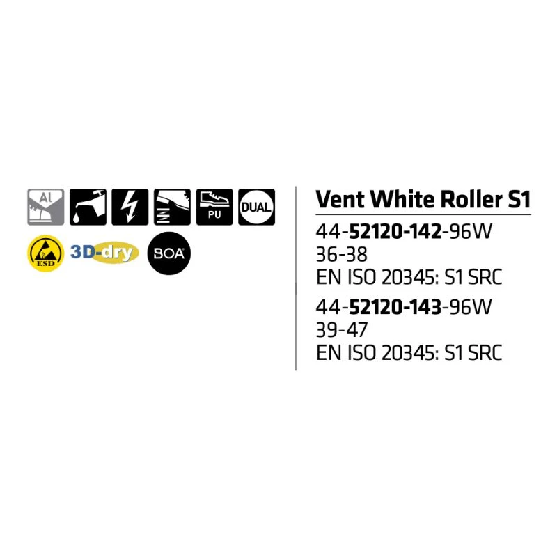 Sievi Vent White Roller S1 turvakenkä BOA® Fit System-kiinnityksellä. Kenkä on valmistettu kestävästä, vettä hylkivästä ja hengittävästä mikrokuidusta. Mikrokuitu kestää myös hyvin usein toistuvaa pesua. FlexStep®-kiilapohja on joustava ja hyvällä pidolla, se kestää myös öljyä ja useita kemikaaleja. Sievi Vent White Roller sopii erityisesti korkeaa hygieniatasoa vaativiin olosuhteisiin. Kengissä on alumiininen varvassuoja, ja dual-pohjallinen lisää mukavuutta.