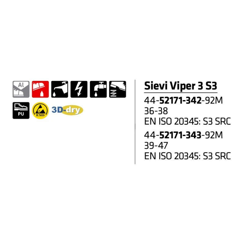 Sievi Viper 3 on nauhakiinnityksellä varustettu ESD-jalkine. Päällismateriaali on hengittävää ja vettä hylkivää mikrokuitua. Mukavuutta ja hengittävyyttä lisää ilmava 3D-dry®-vuori. Pidon ja keveyden maksimoi yksikerrospohja, jonka FlexStep®-materiaali takaa myös erinomaisen iskunvaimennuksen. Erittäin kevyt turvakenkä, jonka ominaisuudet pitää myös jalat kuivina koko päivän.
