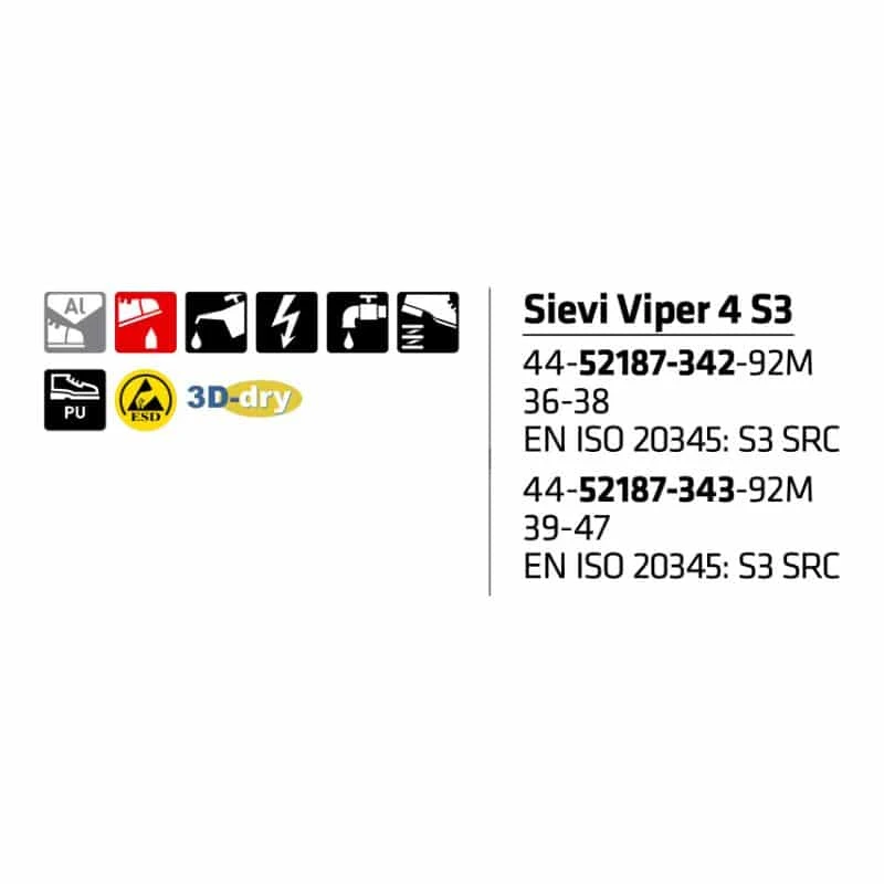 Sievi Viper 4 S3 – tarrakiinnityksellä varustettu ESD-turvajalkine. Erittäin kevyt turvakenkä, jonka ominaisuudet pitää myös jalat kuivina koko päivän. Päällismateriaali on hengittävää ja vettä hylkivää mikrokuitua. Mukavuutta ja hengittävyyttä lisää ilmava 3D-dry®-vuori. Pidon ja keveyden maksimoi yksikerrospohja, jonka FlexStep®-materiaali takaa myös erinomaisen iskunvaimennuksen.
